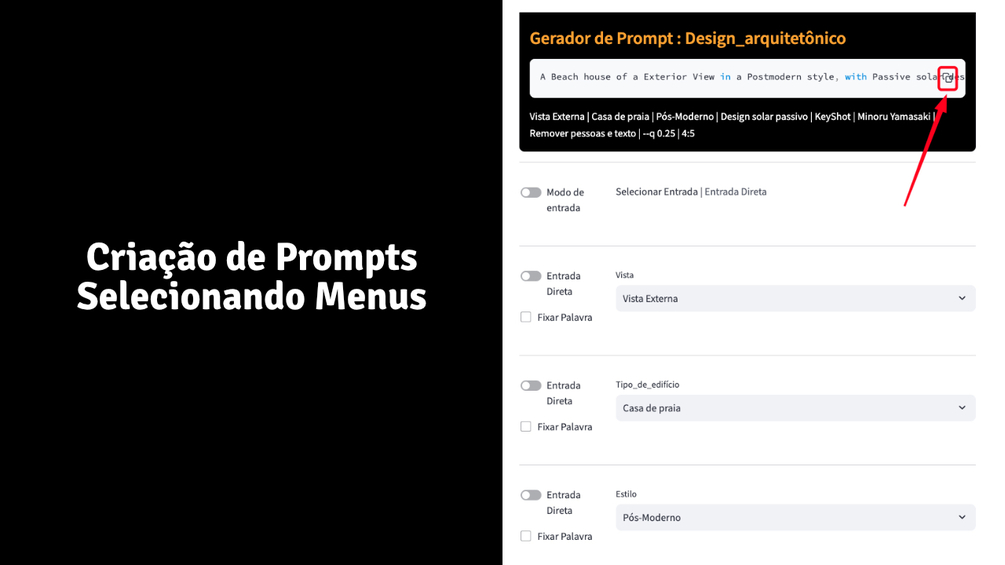 • Criação Totalmente Personalizável de Prompts: De arquitetos a estilos de edifícios, pontos de vista e mais — construa prompts que capturem a essência de sua abordagem de design única.