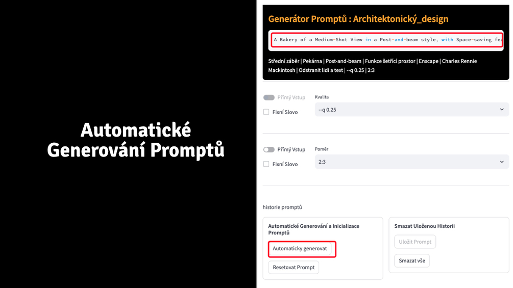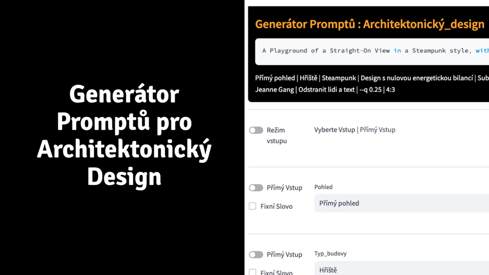 - Nekonečné možnosti přizpůsobení: Prozkoumejte rozsáhlé menu stylů, typů budov, pohledů, nástrojů pro renderování a architektů. Vytvořte přesně takový prompt, jaký potřebujete, aby dokonale odpovídal vizi vašeho projektu.
