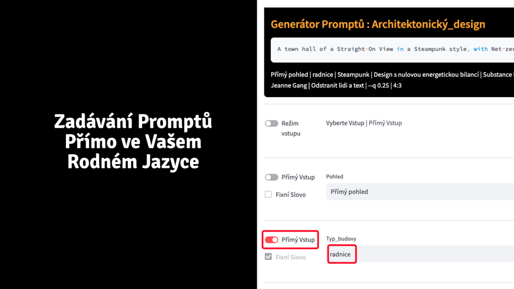 - Vstup v rodném jazyce: Pište prompty ve svém jazyce, překonávejte jazykové bariéry a zaměřte se čistě na svůj návrh.